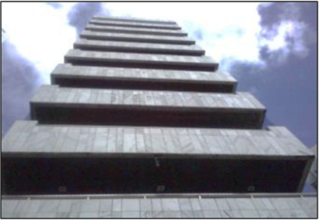 No se observaron juntas de dilatación. La mayoría de las ocurrencias de falla se dio en las placas asentadas horizontalmente, por lo que también fue detectado el desprendimiento de algunas placas de mármol verticales, indicando de hecho la existencia de fallas en la adherencia de las placas de mármol del revestimiento de las fachadas. A partir de la remoción de un pedazo de concreto del fondo da viga del borde, quedó evidente la corrosión de la armadura, y la separación del recubrimiento de la armadura.