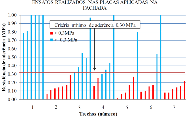 Fueron realizados 6 ensayos de resistencia de adherencia a tracción directa en cada área muestral de la fachada, en un total de 42, distribuidos en los diversos niveles de los pisos. Para la conformación de cada punto a ser ensayado fue importante hacer realizado el ensayo de percusión a través de un profesional con más de 20 años de experiencia de la empresa especializada contratada - laboratorio acreditado por el Instituto Nacional de Metrología, Calidad y Tecnología (INMETRO), homologado por el Ministerio de las Ciudades como una Institución Técnica Evaluadora (ITA), apta para ensayar el desempeño de sistemas constructivos innovadores ó aún no comercializados en el mercado brasileiro.