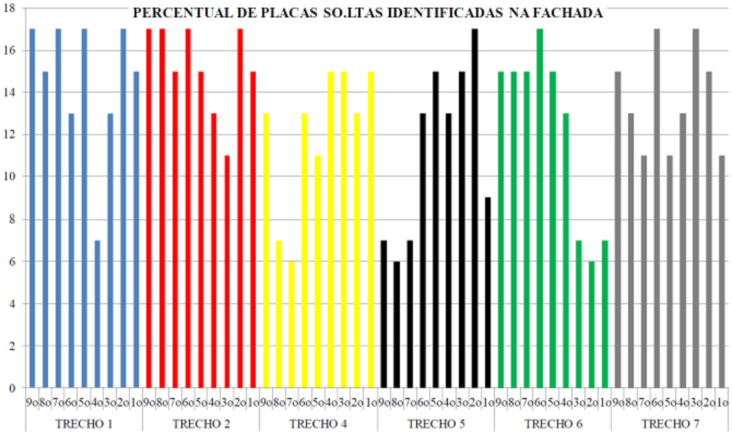 Cabe destacar, inicialmente, que los trechos ensayados (T) estaban revestidos con placas de mármol, excepto en el trecho 3, que presenta placas cerámicas en el acabado y cuyos resultados fueron satisfactorios. A juzgar por los criterios normalizados, los valores obtenidos evidencian clara deficiencia en la resistencia de adherencia en los trechos 2, 5, 6 y 7.
