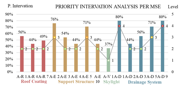 It is clear from the priority levels found that most problems are at level 2, i.e., without immediate repair, with medium term actions (2 to 5 years), but with constant monitoring of the situation to verify the evolution of anomalies. The skylight, for example, is in good condition and with intervention level 1, i.e., it has no urgent actions.