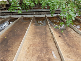 In the internal visit held on 10/30/2018 in the morning, after a rainy season, leaks were observed in the ceiling of the classroom corridor (area 1, 2 and 3), even after rain had ceased, as shown in Figure 3 and Figure 4. The gutters are multiple and are spread over a wide area of the ceiling.