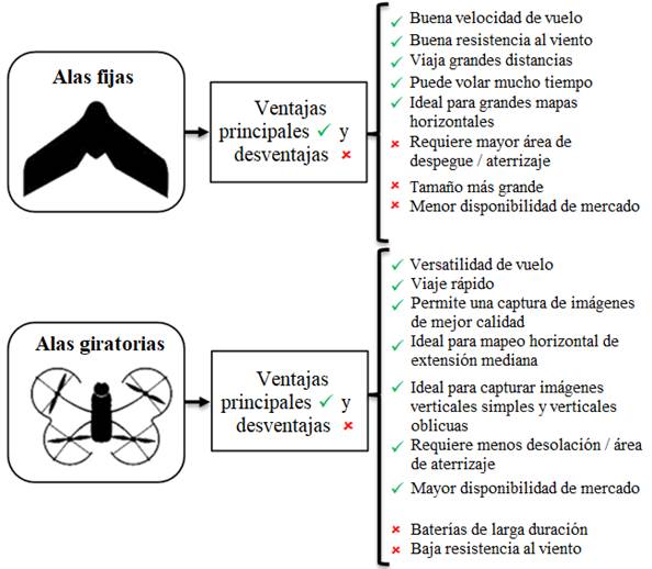Del mismo modo, la versatilidad de esta aeronave permite su movimiento en todos los ejes posibles, siendo eficaz en la captura de imágenes verticales simples y verticales oblicuas como es presentado en los casos de estudio de Mader et al. (2016), Morgenthal y Hallermann (2015) y Reagan et al. (2018) en la detección de superficies ó elementos específicos, constituyendo así, una herramienta útil para la inspección visual del cerramiento vertical ó como en el caso de estudio de Irizarry y Costa (2016), una herramienta visual para la gerencia del cantero de obra. En la Figura 1 es presentado el resumen de las principales ventajas y desventajas de los vehículos con alas fijas y rotatorias.