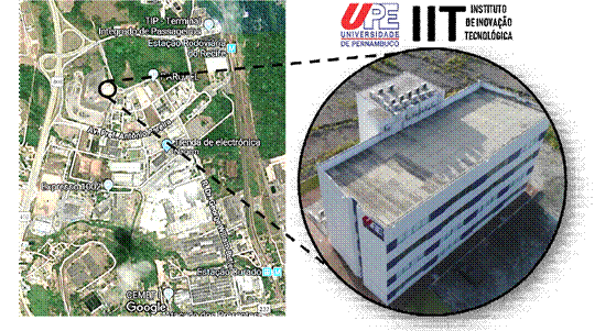 Basados en directrices inferidas de la revisión bibliográfica y buscando verificar la viabilidad del uso de VANT para la inspección de manifestaciones patológicas de fachadas, se escogió el Instituto de Innovación Tecnológica (IIT) de la Universidad de Pernambuco. El edificio (Figura 4) del instituto posee cuatro pisos y está localizado en el PARQTEL (Parque Tecnológico de Electroelectrónicos) de Pernambuco, en la urbanización de curado (Figura 4). Esta edificación fué seleccionada por sus características geométricas (múltiples fachadas) y su localización aislada en relación a otros edificios en la localidad, característica ideal para el entrenamiento y perfeccionamiento de los vuelos con el VANT y el desarrollo de los protocolos de vuelo.
