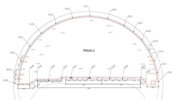 The fiber section between 40 and 50m??? corresponds to the track area. In this section is where there is more excitement of the fiber given the railway step. The vibration caused by the railway circulation results in more distortion of readings in this section. Even so, it is observed how these variations of recorded microdeformations have a tendency to increase to compression, which is consistent with the decompression and ovalization suffered by the curved section of the tunnel and which causes the slab to perform a strut function in response of this action. The ovalization of the tunnel is explained at the next point. Likewise, under no circumstances do the obtained values exceed the notice limit set out in the Auscultation and Contingency Plan.