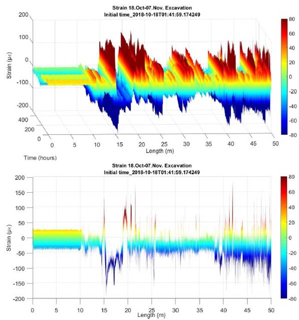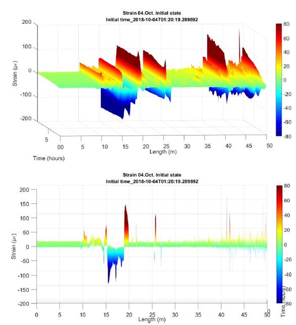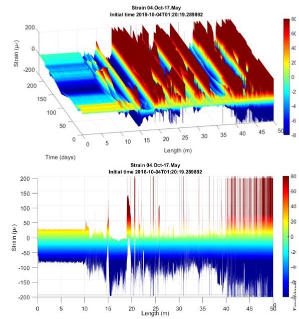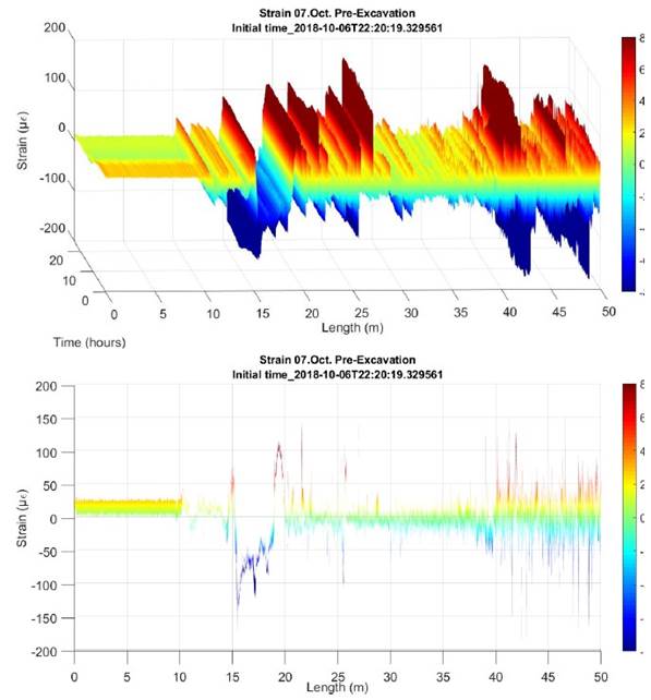 For these loading stages, the expected values are set, and a contingency plan is created with warnings, alerts, and alarms in case they are exceeded. As the work progresses, the instrumentation carried out in the tunnel with the optical fiber registers the values obtained continuously or semi-continuously, which allows to know at all times the possible dysfunctions that occur in the section (ovalizations, microdeformations, new fissures, etc.) and act accordingly. The period provided for the execution of the work is 18 months, once the work is finished, the implementation could be maintained and readings could be made when, for example, incidents occurred and its impact on the structure of the tunnel from which its "history of loads" is obtained.