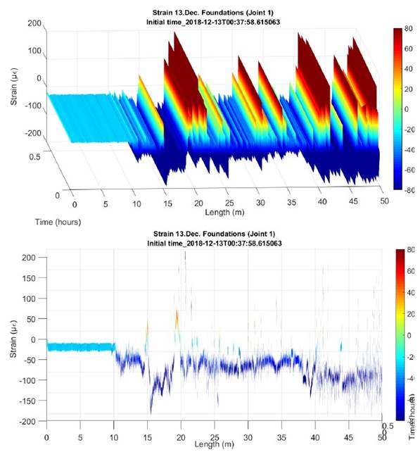 In addition, peaks and/or discontinuities obtained from monitoring can be seen, which correspond to the joint areas between sections of the dovelas where the optical fiber suffers a disadherence with the concrete, since its implementation at source. These peaks remain stable in terms of their location.