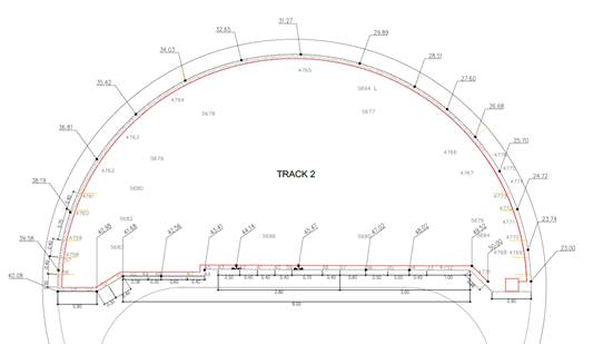 A tunnel section is being monitored, which has, to date, carried out a control of the structure in service during the eight months (October 2018 - May 2019) covering the construction of the structure of a building on the track, up to the 1st floor level, in the building area above the tunnel.