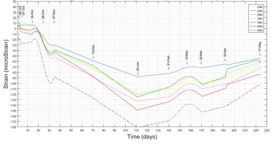 The fiber section between 23 and 40m ???corresponds to the area of the vault. This section shows how, in general, there has been an increase in compression microdeformations throughout the instrumentation. This is due to the decompression caused by the excavation and emptying of land from the work, so that this decompression produces a certain "ovalization" of the section, which results in an increase in compression in the inner fiber of the section (the inner fiber of the section is compressed and the outer fiber of the decompression section). It can be clearly seen as going from a green color (null and initial deformation) to a blue color indicating compression. Likewise, under no circumstances do the obtained values exceed the notice limit set out in the Auscultation and Contingency Plan.