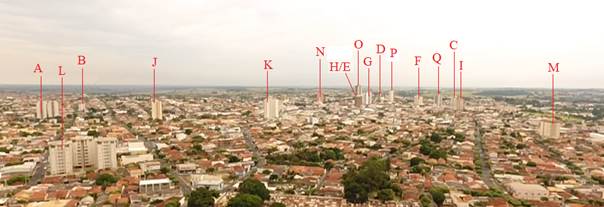 Así, el universo muestral de 22 edificios cumple con este criterio, ordenados en diferentes regiones de la ciudad, como se destaca en la Figura 1. Los edificios se denominaron de la A a la Q, y había dos condominios de cuatro y tres torres, que se denominaron A1, A2, A3, A4, L1, L2 y L3, respectivamente. Cabe destacar que, como se seleccionaron todos los edificios del municipio que cumplían con estos requisitos, no se utilizó ninguna técnica ni recomendación para elegir el universo muestral. Los edificios seleccionados tienen sistemas de construcción y arquitectura similares, con variaciones en la forma, dimensión, acabados y elementos arquitectónicos de la fachada, utilizando predominantemente RAF como acabado de la fachada.