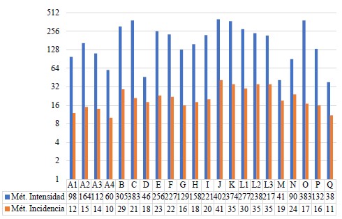 Estos métodos fueron utilizados por Segat (2005) en los que se basan en dos formas diferentes de cuantificar los casos patológicos observados. En el método de incidencia, cada MP se cuenta solo una vez por fachada, incluso si ocurre repetidamente, mientras que en el método de intensidad, se cuenta cada MP, independientemente de la cantidad de repetición.