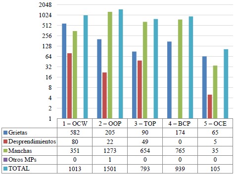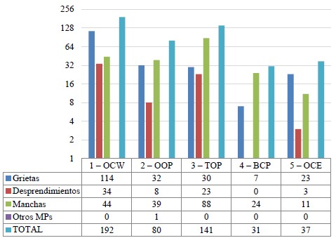 En general, existen diferencias muy importantes entre los resultados de cada método aplicado en la cuantificación para determinar el Potencial de Degradación (DP). Esto ocurre, por tanto, la recurrencia de efectos para cada método específico ocurre de manera diferente, es decir, uno por el número total de repeticiones y el otro por el número de veces que ocurre, sin considerar las repeticiones para la misma fachada. Por tanto, se puede identificar la potenciación de los efectos para cada método y MP. Por ejemplo, como se destaca en la Tabla 3, aunque existe la misma recurrencia para manchas y grietas, existe un número mucho mayor de repeticiones de las manchas contra las grietas, de ahí la importancia de considerarlas de forma independiente y, no obstante, interpretar sus resultados.