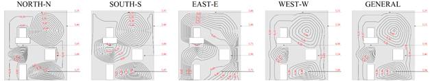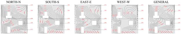 • Relativamente al número de problemas, dado el número de repeticiones de manchas en las direcciones Este y Oeste, para el Método de Intensidad hubo una mayor cantidad de anomalías en las fachadas antes mencionadas, seguido de las fachadas Norte y Sur, mientras que para la Incidencia Método, el predominio fue en la fachada Este, seguida de la Norte, Sur y Oeste.