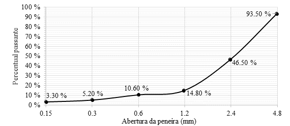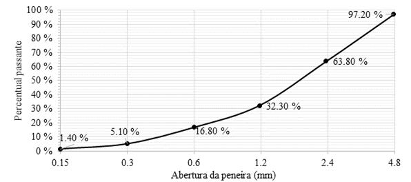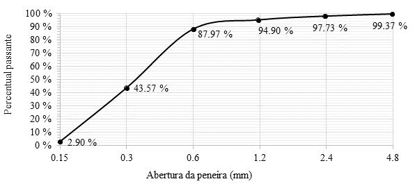 O cimento utilizado no estudo foi o cimento Portland tipo CP ll-F-40, com uso de fíler e sem adições pozolânicas. A areia utilizada neste estudo foi areia quartzosa extraída de rios. A massa unitária obtida da areia foi de 1.592,16 kg/m3 e a massa específica de 2.427,36 kg/m3. A obtenção da granulometria da areia, apresentada na Figura 1, foi realizada através de ensaios de acordo com a NBR NM 248 (ABNT, 2003). Como solução química foi utilizado silicato de sódio neutro, em estado líquido, um composto de fórmula Na2SiO3, devido a sua alta compatibilidade com matrizes cimentícias, sendo ele diluído no teor de 50% em água deionizada, motivo pelo qual a relação água/cimento deste traço é metade dos anteriores.