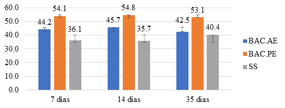 Os resultados obtidos para resistência à compressão são apresentados na Figura 4. Pode-se perceber, que a resistência à compressão se manteve muito semelhante ao longo do tempo, o que pode decorrer do cimento utilizado, que já apresenta alta resistência logo nas primeiras idades. A maior diferença encontrada se dá no traço SS, com uma diferença de 4,7 MPa (11,63%) de resistência, entre os 14 e 35 dias. O SS pode ter gerado nesse período C-S-H decorrente da sua ativação, por não depender da fissuração para atuar (GIANNAROS et al, 2016)