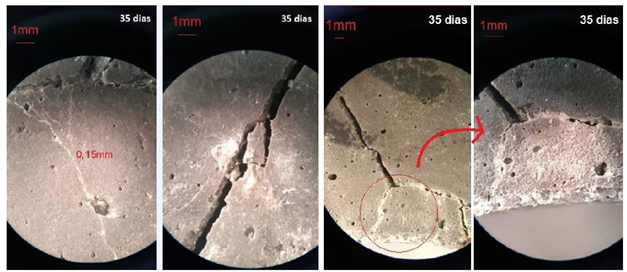 Ao comparar com a bibliografia, é visto que Zhang et al. (2017), recuperaram fissuras de até 0,79mm aos 28 dias de cura, sendo esta diferença provavelmente constatada devido aos autores utilizarem outro material regenerante, especificamente, a bactéria Bacillus cohnii encapsulada em perlita e revestida com geopolímero. Da mesma forma, Jiang et al. (2020), ao estudarem o encapsulamento de B. cohnii em perlita expandida conseguiram selar fissuras de até 0,4mm, valor muito próximo aos encontrados no presente trabalho. Liu et al (2021) relatam a cicatrização de 0,25mm.