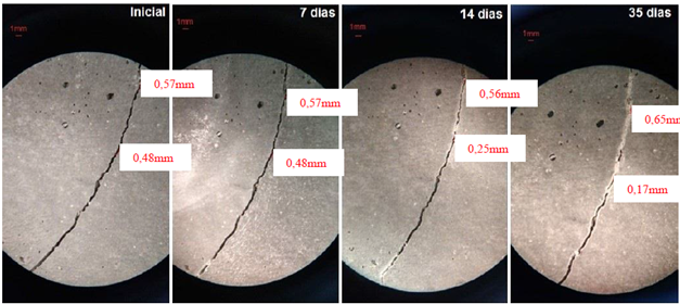 Houve cicatrização em vários pontos ao longo da fissura, sendo a maior largura de fissura completamente selada de 0,57mm. Percebeu-se o caráter progressivo da cicatrização, sendo a fissura inicial de 0,48mm com apenas 0,17mm na idade final, concordando com Zhang et al. (2017). Outra observação que pode ser feita é que a distribuição do produto não foi uniforme na fissura, o que pode decorrer da disponibilidade da perlita no local para a liberação do produto de regeneração e consequente formação de calcita, o que condiz com o estudo realizado por Alghamri et al. (2016).