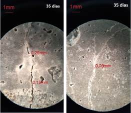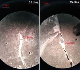 Referente ao traço SS, a Figura 8 apresenta uma fissura com abertura inicial de 0,31mm e final de 0,09mm. Também é importante destacar que houve uma cicatrização em placas pontuais em ambas as amostras, visíveis ao microscópio a partir da idade de 14 dias. Isso pode ser atribuído à existência de pequenos poros superficiais que permitem o acúmulo de água, criando assim um ambiente favorável à autocicatrização. No traço SS, a espessura máxima de fissura cicatrizada foi de 0,29mm, apresentada na amostra 1.