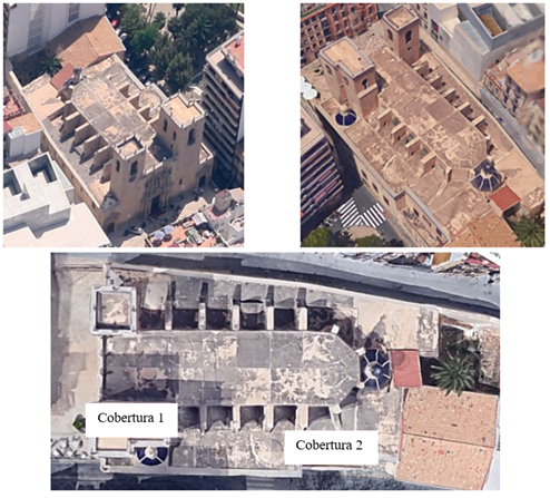 Figura 1 Vista aérea da Basílica de Santa Maria, Alicante. Sup. esquerda: fachada noroeste. Sup. direita: fachada sudeste. Abaixo: Vista plana da Basílica de Santa Maria. Alicante. Identificação das coberturas do estudo. Fonte: Imagens ©2016 Google, Dados do mapa ©2016 Google, Inst. Geogr. Nacional.