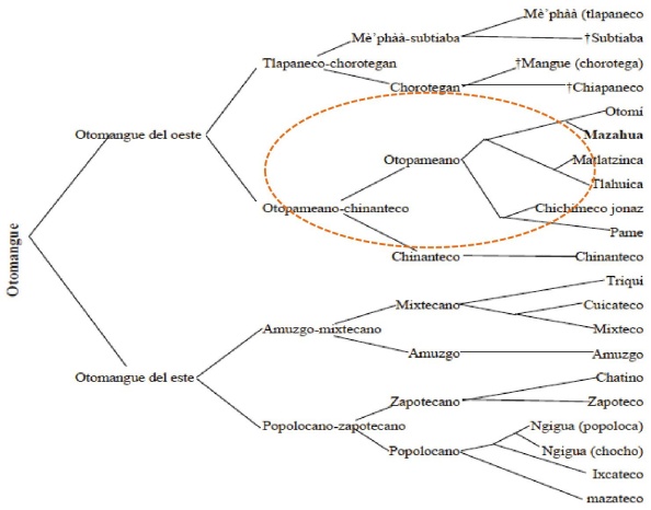 El mazahua es una lengua que pertenece al tronco lingüístico otomangue; más específicamente a la familia lingüística otopameana que a su vez pertenece al subgrupo otopameano-chinanteco. En el siguiente diagrama mostramos la clasificación que se ha propuesto para explicar el grado de relación de los subgrupos de las lenguas que conforman el tronco otomangue (Campbell 2017 basado en Kaufman 1988).