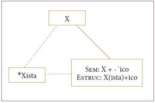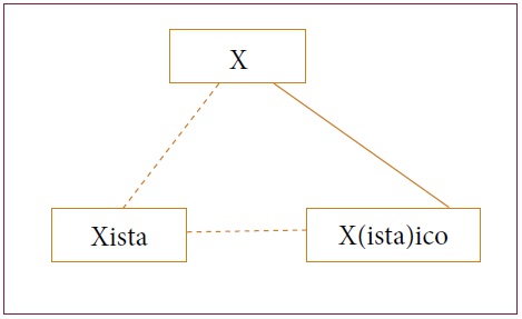 En la Figura 2b ya se observa la falta de ismorfismo entre forma y significado, pues, aunque formalmente, en las líneas discontinuas se observen dos procesos (la formación de Xista y la formación de Xista+-´ico), semánticamente (representado por la línea continua), Xista+-´ico se relaciona con la base simple, X. Este fenómeno se presenta por la posibilidad iterativa que tienen los sufijos que forman adjetivos relacionales.