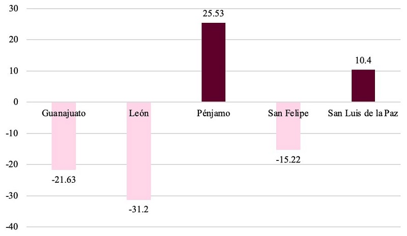 En la Gráfica 2, podemos notar que asistimos a una alteración casi total del orden de las ciudades en esta proyección de las frecuencias relativas acumulativas de [ɕː]. En los datos del Atlas lingüístico de México, expuestos en la Gráfica 1, el ordenamiento de las localidades era Guanajuato > León > San Felipe > Jerécuaro > San Luis de la Paz > Pénjamo; mientras que, en los datos contemporáneos, la jerarquización es Pénjamo > San Luis de la Paz > Guanajuato > Acámbaro > San Felipe > León, siendo Pénjamo y León los casos más destacables por haber invertido totalmente su posición en la curva. Otra posible vía para considerar a cabalidad este proceso es sustraer los porcentajes reportados en el Atlas a los porcentajes documentados contemporáneamente, como se presenta en la Gráfica 3.