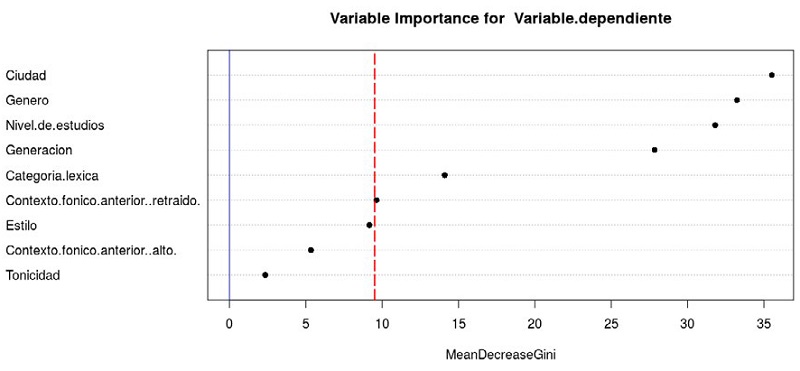 En la Figura 6, se reproduce el bosque aleatorio obtenido después del análisis de la totalidad del corpus, tanto el de 1972 como el de 2019. En este tipo de análisis, las variables significativas son aquellas que aparecen a la derecha de la línea roja punteada.