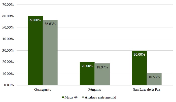 En esta gráfica, es posible advertir que, exceptuando los porcentajes de San Luis de la Paz, los datos del análisis instrumental casan bastante con los datos reportados en el mapa 44 del Atlas. A propósito de la disparidad encontrada en los datos ludovicenses, una posible explicación es que el ruido de fondo de alguna de las grabaciones pudo haber sido confundido con articulaciones fricativas, particularmente la entrevista de la informante 2 de San Luis de la Paz, cuyo audio no tiene la mejor calidad acústica.