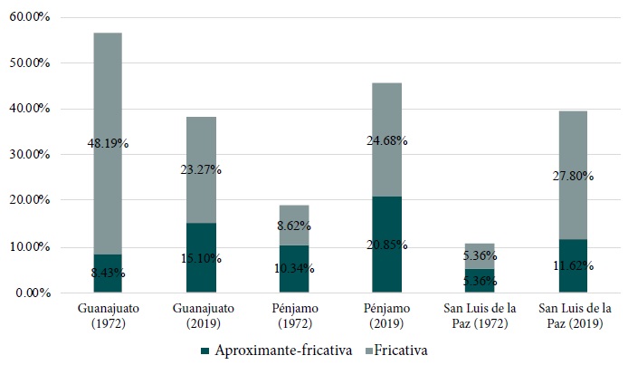 A diferencia de lo que sugería la comparación de los dos cortes temporales en conjunto, al desagregar las tres localidades sí se advierten grandes alteraciones en la frecuencia de las variantes, especialmente en la pugna entre [ɹ] y los dos grados de fricativización. Por lo que concierne a Guanajuato, las soluciones fricativas y aproximantes-fricativas han pasado de ser los alófonos mayoritarios, con el 56.63% en 1972, a ocupar el segundo lugar, algo detrás de las variantes aproximantes. En cuanto a Pénjamo, las variantes aproximantes y las variantes asibiladas exhiben frecuencias más o menos cercanas en los datos de 2019, pero las segundas son ahora ligeramente más frecuentes, en contraste con lo que ocurría en 1972, cuando las variantes asibiladas estaban casi 45 puntos porcentales por detrás de las variantes aproximantes. Finalmente, con respecto a San Luis de la Paz, los alófonos aproximantes siguen siendo los más frecuentes, pero ya no constituyen la mayoría de las articulaciones de /ɾ#/ y las realizaciones [ɕː ɹ̝] han casi cuadruplicado sus tasas de aparición, pasando del tercer al segundo puesto.