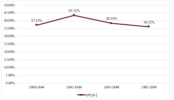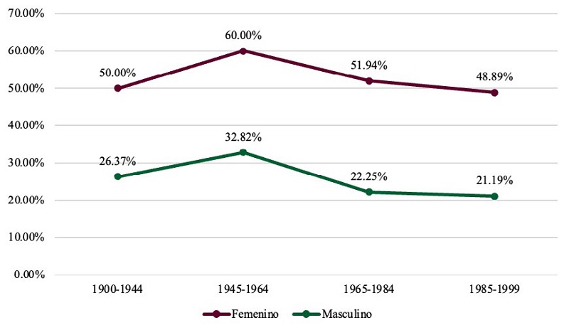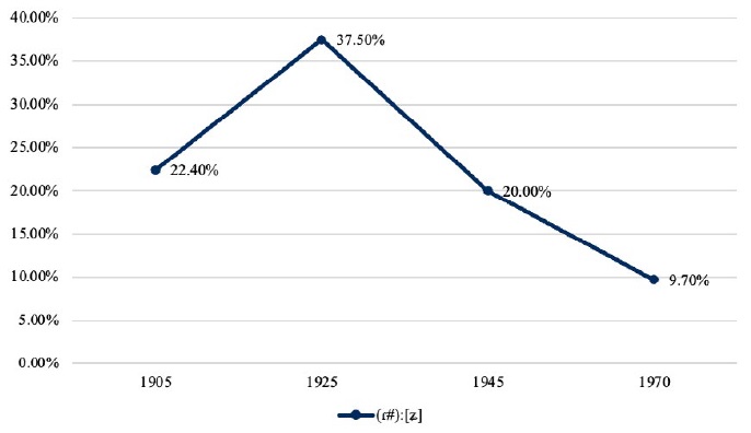 En lo tocante al género de los hablantes, podemos ver que se cumple nuestra hipótesis de que, tanto en los datos de 1972 como en los datos de 2019, serían las mujeres quienes tendrían las mayores tasas de asibilación, aunque los hombres han reducido un 3% su distancia con respecto a ellas. Sobre la evolución de la asibilación de /ɾ#/ en tiempo aparente, en la Gráfica 12 se presentan el porcentaje de [ɕː ɹ̝] según el género y el año de nacimiento de los entrevistados. En esta gráfica, podemos ver que tanto hombres como mujeres han seguido el mismo patrón de adopción de la asibilación de la percusiva, pero los hombres siempre por detrás de las mujeres, sin reducir en ningún momento su distancia con respecto a la asibilación de ellas en menos de 23.63%.