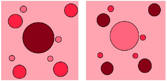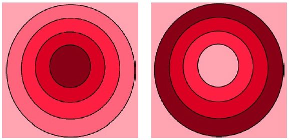 En las Figuras 4 y 5, esbozamos una representación de la relocalización, tanto en patrón epidémico (Figura 4), como en patrón jerárquico (Figura 5). En dichos esquemas, una tonalidad más oscura del color debe interpretarse como una mayor frecuencia del rasgo hipotético que se está difundiendo en el espacio. En la Figura 5, el tamaño de los círculos representaría el peso demográfico, social o político de los asentamientos en la red urbana del territorio.