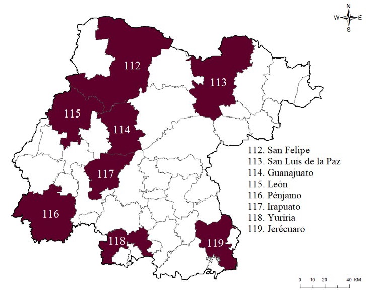 | San Felipe | San Luis de la Paz | Guanajuato | León | Pénjamo | Irapuato | Yuriria | Jerécuaro |