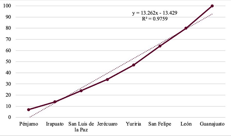 Esta forma de presentar los datos permite avanzar algunas hipótesis, como la escasa frecuencia de realizaciones fricativas en el Bajío guanajuatense suroccidental, representado con los datos de Irapuato y Pénjamo, en cuyas entrevistas se registró un 20% de alófonos asibilados, razón por la que aparecen en las últimas posiciones de la gráfica. Esta distribución geolingüística de la asibilación cuadra con lo observado en el Mapa 1, extraído de la obra de Moreno de Alba (2002 [1994]), donde ya se apreciaba que el suroeste de Guanajuato quedaba fuera de la zona coloreada como la de mayores tasas de [ɕː]. De igual forma, se advierte en esta gráfica que el primer lugar de la curva lo ocupa Guanajuato capital, dado que aportó un 60% de asibilación. En este hecho podemos notar un primer indicio de una posible difusión de patrón jerárquico, ya que si aceptamos la propuesta de Moreno de Alba (1972) de que la Ciudad de México era el foco irradiador de la asibilación en aquella época, Guanajuato tendría que ser de las primeras localidades en adoptar el rasgo innovador, aunque esté más alejada de la Ciudad de México que Jerécuaro o Yuriria, por su posición en el entramado urbano de México como capital de estado.