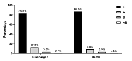 Figure 2 Comparison of ABO blood group distribution between hospitalized patients with COVID-19 who died or were discharged. Source: Own data.