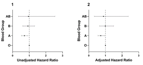 Figure 4 Forest Plot showing Hazard Ratios of death for ABO blood types during the period between March 23 and December 10, 2020. 1. Unadjusted Cox Proportional-Hazard model. 2. Adjusted Cox Proportional-Hazard model, considering age, sex, type 2 diabetes, hypertension, and obesity. Source: Own data.