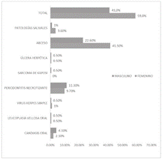 De los resultados que se muestran en la figura 3, se puede determinar que el 59% de los pacientes que presentaron enfermedad de la mucosa oral, en el servicio de odontología del Hospital Regional Docente las Mercedes, 2014- 2018 fue de género femenino y 41% del género masculino; las patologías salivales son frecuentes en un 3.6% en el género femenino de igual manera los abscesos con una frecuencia de 41.5% y el virus herpes simple con una frecuencia de 1.0%; la úlcera herpética y la leucoplasia vellosa tiene la misma frecuencia en ambos sexos, el sarcoma de Kaposi es frecuente en el género masculino en un 0.5%, igual que la periodontitis necrotizante con una frecuencia de 11.3% y la candidiasis oral con una frecuencia de 4.1%.