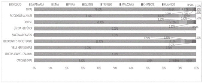 Con respecto a la procedencia se puede determinar que el 79.0% de los pacientes que presentaron enfermedad de la mucosa oral en el servicio de odontología del Hospital Regional Docente las Mercedes, 2014 - 2018 provienen de la ciudad de Chiclayo, el 10.80% de la ciudad de Cajamarca, el 4.1% de la ciudad de Lima, el 3.1% de la ciudad de Piura y en porcentajes menores de otras 5 ciudades. No hay resultados regionales que difieran o se asemejen.