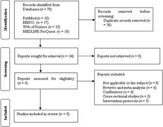 After searching the studies in the four databases, 70 articles were obtained from which 51.4% were eliminated because they were duplicates. Subsequently, the titles and abstracts were examined, and when necessary, the full text was reviewed. Of the 34 articles, 37.1% were eliminated because they did not meet the inclusion criteria, leaving a total of eight (11.4%) articles (Figure 1).