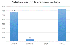 Por otra parte, la figura 1 muestra el nivel de satisfacción de los usuarios con la atención recibida en el servicio evaluado. De un total de 733 encuestados, la gran mayoría (678 personas, 92.5%) manifestó estar muy satisfecha con la atención. En contraste, 54 usuarios (7.4%) calificaron su experiencia como regular, y solo 1 persona (0.1%) indicó no estar nada satisfecha. Estos resultados reflejan una alta percepción positiva del servicio, con una proporción mínima de usuarios que reportaron insatisfacción, lo cual sugiere una eficiente calidad en la atención brindada y una adecuada respuesta a las expectativas del paciente o usuario.