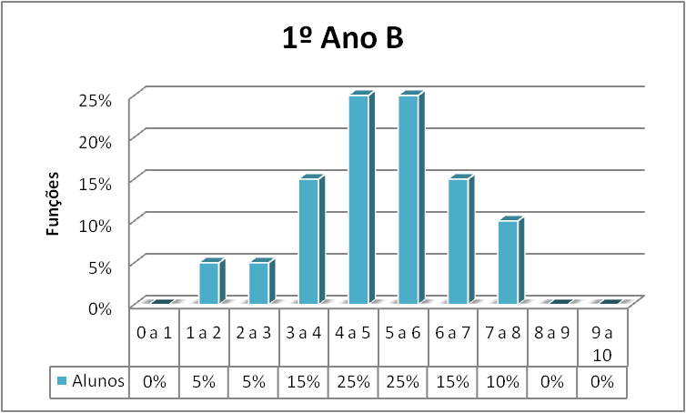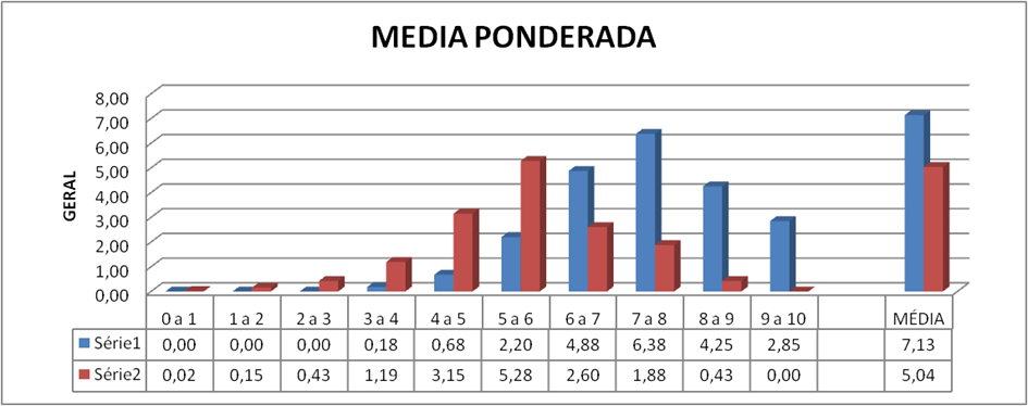 Abaixo, tem-se a Figura 10, representando o gráfico comparativo entre as turmas A e B. Analogamente à figura anterior, o primeiro ano A está representado pelas colunas vermelhas, enquanto a turma B está representada pelas colunas azuis. Nele, observa-se a distribuição das médias ponderadas das notas das três unidades de cada turma por classes de notas. A fórmula da média ponderada usada é: