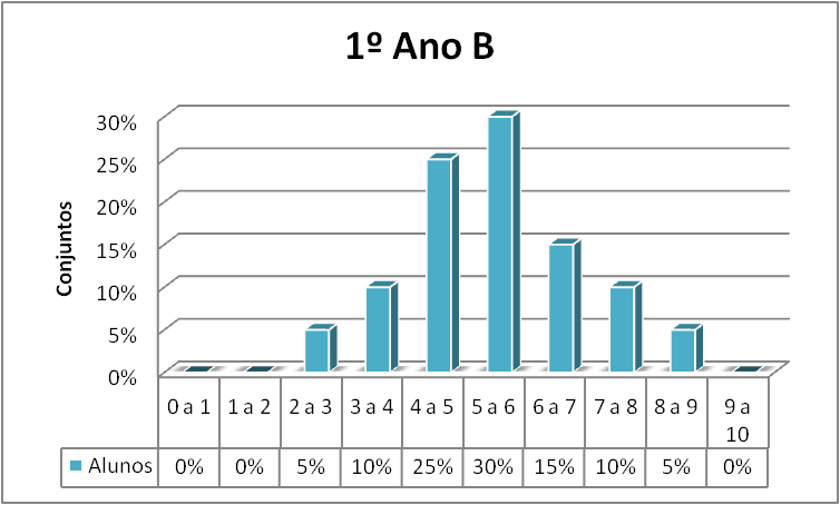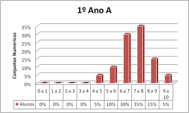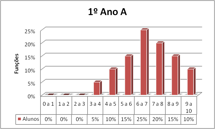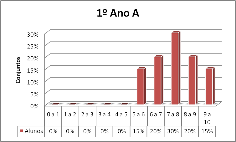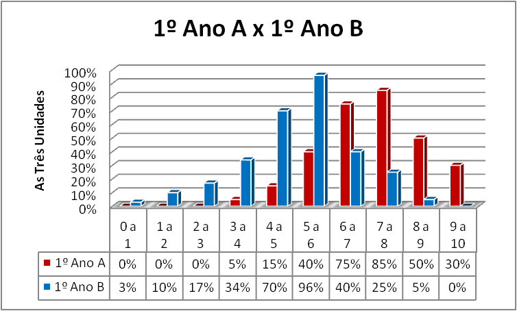 Abaixo, tem-se a Figura 9, representando o gráfico comparativo entre as duas turmas. O primeiro ano A está representado pelas colunas vermelhas, enquanto a turma B está representada pelas colunas azuis. Nele, observa-se a distribuição do somatório das notas das três unidades (Conjuntos Numéricos, Conjuntos e Funções) de cada turma por classes de notas. Vale ressaltar que o total de cada turma, neste gráfico, chegará a 300%, pois é a soma percentual das três unidades. Isso não tem relevância, pois o cálculo da média será feito posteriormente na figura 10. Analisando o gráfico, observa-se que a Turma A obteve os seguintes resultados: de 0,0 a 3,0, 0% dos alunos; de 3,1 a 4,0, 5% dos alunos; de 4,1 a 5,0, 15% dos alunos; de 5,1 a 6,0, 40% dos alunos; de 6,1 a 7,0, 75% dos alunos; de 7,1 a 8,0, 85% dos alunos; de 8,1 a 9,0, 50% dos alunos; de 9,1 a 10,0, 30% dos alunos.Já a turma B obteve: de 0,0 a 1,0, 3% dos alunos; de 1,1 a 2,0, de 2,1 a 3,0, 10% dos alunos; 17% dos alunos; de 3,1 a 4,0, 34% dos alunos; de 4,1 a 5,0, 70% dos alunos; de 5,1 a 6,0, 96% dos alunos; de 6,1 a 7,0, 40% dos alunos; de 7,1 a 8,0, 25% dos alunos; de 8,1 a 9,0, 5% dos alunos; de 9,1 a 10,0, 0% dos alunos.
