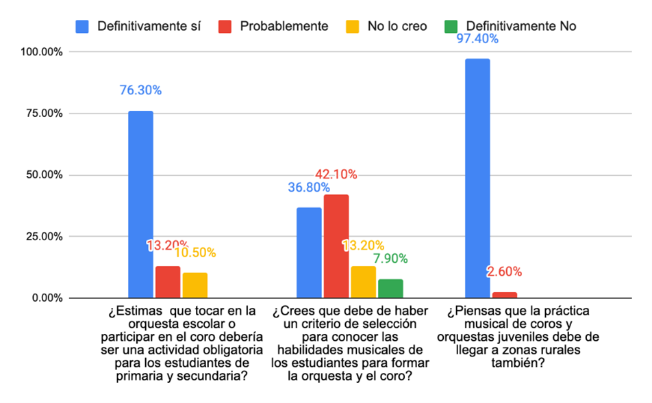 Los resultados de las preguntas son los que a continuación se describen. La mayoría de los participantes opinó que es posible que la música, a través de las orquesta y coros juveniles, pueda servir como aliado para la prevención del delito; más de la mitad piensa que probablemente sí se podrían prevenir embarazos no deseados con la práctica orquestal, y que la empatía de los niños y jóvenes puede mejorar, según afirma la mayoría de los encuestados (ver Figura 1).