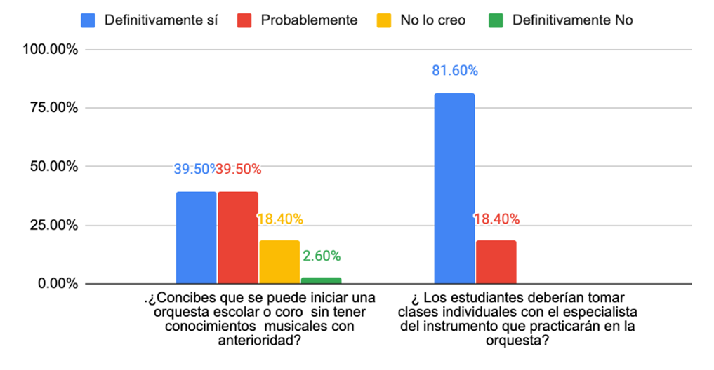 Asimismo, la mayoría de los participantes piensa que probablemente no sea necesario tener conocimientos musicales con anterioridad para formar parte de estas agrupaciones, cuyo fin es el de fortalecer la educación integral en los estudiantes. Se observó que definitivamente los integrantes de coros y orquestas juveniles deberían de tener acceso a clases individuales de instrumento para robustecer su formación y lograr tener una provechosa práctica orquestal (ver Figura 4).