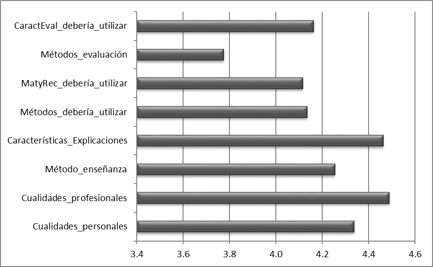 | Características de la metodología de enseñanza del buen profesor | 4.36 | 4.19 | 4.25 |