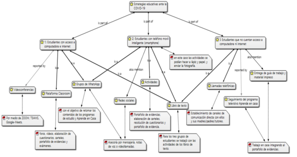Los resultados indican que, ante la contingencia sanitaria generada por la covid-19, los docentes han utilizado diversas estrategias educativas, las cuales dependían del acceso que los estudiantes tuvieran a las TIC. En tal sentido, se identificó que 1) 60 % de los alumnos contaba con computadora e internet, 2) 80 % con internet y dispositivo móvil inteligente, y 3) 15 % no contaba con internet o computadora. A partir de estas tres categorías, en la Figura 1 se enseñan las estrategias implementadas con cada grupo: