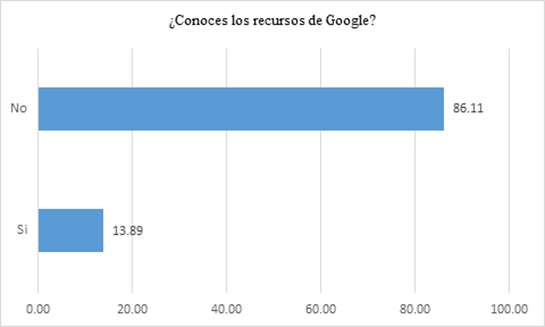 Por último, dentro de las interrogantes que se adaptaron al instrumento se muestra el resultado de la pregunta sobre el conocimiento que tenían los estudiantes acerca de los recursos de Google, la Figura 7 representa los resultados del conocimiento de las herramientas de Google por parte de los alumnos.