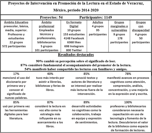 Se realizaron diez proyectos de fomento de la lectura en ambientes digitales que impactaron a 153 participantes directos, a 4148 usuarios de Facebook, a 698 de Instagram y a 800 de Twitter. Estos reportes mostraron lo siguiente: (1) a pesar del uso extendido de los soportes electrónicos de lectura, muy pocos los utilizan para leer literatura o para compartir experiencias lectoras, (2) a la par de la evolución de las TIC, se transforman los mensajes, imágenes, textos y combinaciones entre ellas, así como las nuevas formas de transmisión, y (3) cómo se ha alterado el ecosistema de la lectura y, con ello, cómo se han visto modificadas las expresiones sociales y culturales (Albarello, 2019; Gómez Díaz et al., 2016).
