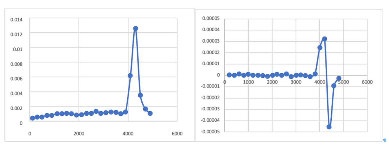 Figura 1 Gráficos de primera derivada (izquierda) y segunda derivada (derecha) para la titulación de ácido cítrico con NaOH