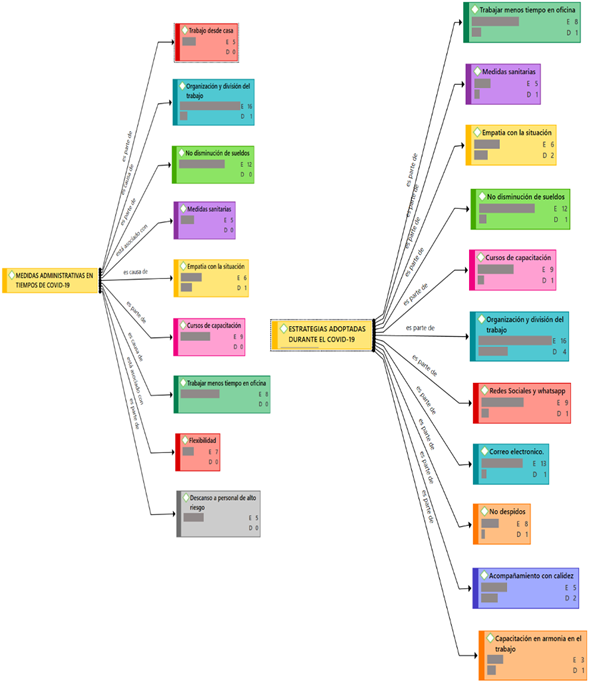 La segunda parte de la entrevista versó sobre las medidas administrativas y las estrategias adoptadas durante la covid-19.Een la Figura 3 se puede observar que la mayoría de los entrevistados comenta que las medidas tomadas fueron la organización y división del trabajo, la no disminución de sueldos, el descansar a personal de alto riesgo y trabajar menos tiempo en oficinas. Como estrategias adoptadas se encuentran los no despidos, la comunicación efectiva a través de correo electrónico, redes sociales, WhatsApp, un acompañamiento con calidez y cursos de capacitación para llevar a cabo sus labores ante la contingencia.