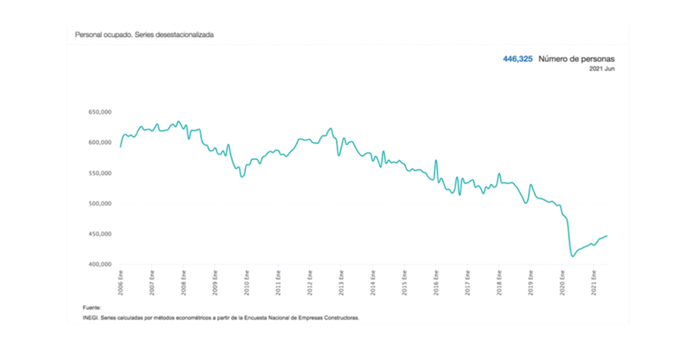 En cuanto a la distribución por género del personal ocupado en el sector de la construcción a nivel nacional (676 301 puestos en total), 87 % eran hombres y 13 % mujeres (Inegi, 2019a). En 2021 se generaron 446 325 empleos.