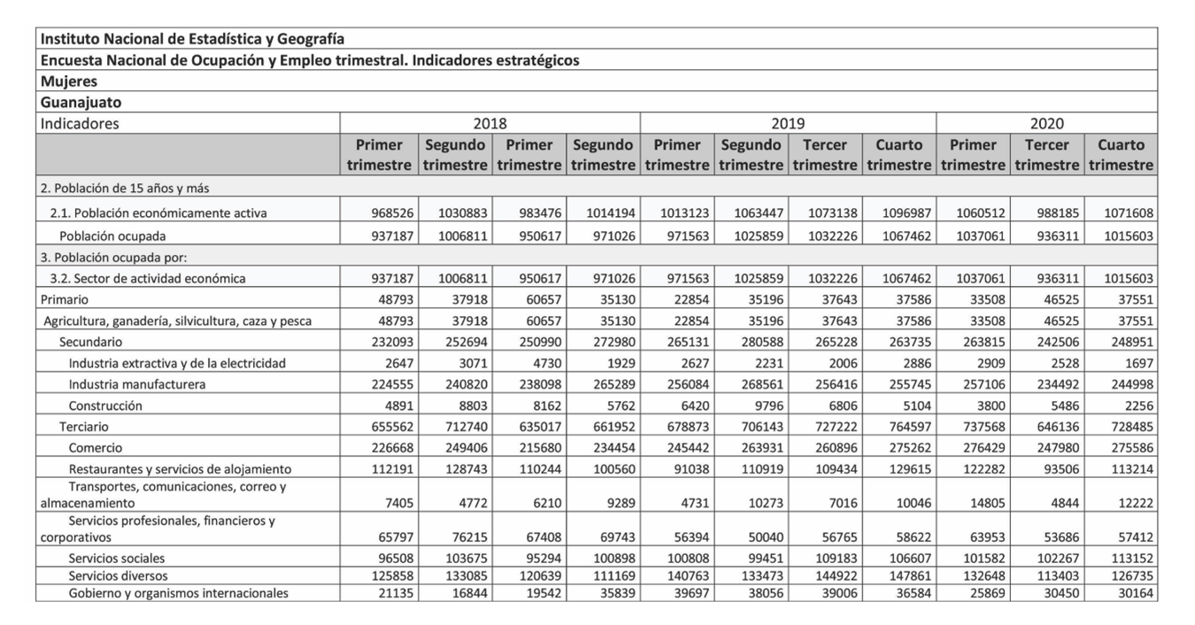 Tomando en cuenta los datos arriba mencionados, en el último año en Guanajuato se ha perdido 44.2 % de los empleos de las mujeres en el sector de la construcción, lo cual indica una situación grave para la economía femenina.